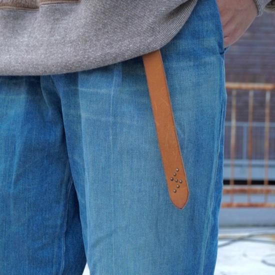Sugar&Co. Daddy's belt レザーベルト Sugarとして初めてのリリースとなるレザーベルトは、 はめた時のバランス、耐久性、使い勝手の良さ、何より定番daddys pantsとの相性を考えて作成しました。 ベルト幅23mm、全長125cmの剣先を垂らしてご使用頂くナロータイプで、 もちろん、どのようなパンツとの相性も抜群です。 しっとりとした手触りと小ぶりで主張しすぎないシボが特徴の厚さ3mm の牛革を使用しており、使いこむことで艶が上がり更にしなやかな手触りへと変化していきます。 バックルにはサイズレスでご使用いただけるローラーバックル、剣先にはSモチーフのスタッズ、共に真鍮ならではの経年変化をお楽しみください。 コーディネートをグッとしめてくれる頼りになる一本の完成です。 オリジナル巾着袋に入れてのデリバリーとなります。 2024AW 新色TANが追加