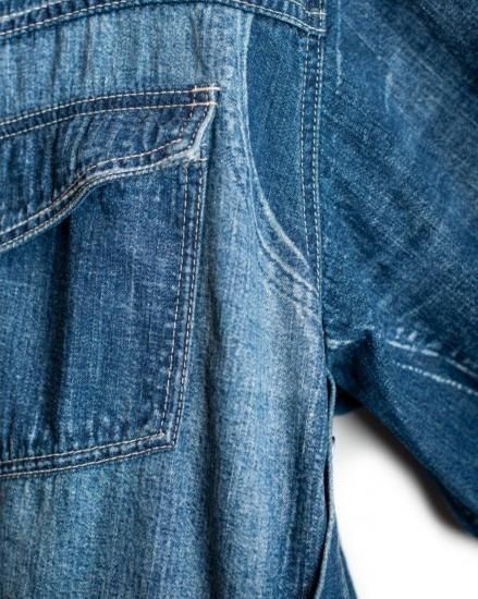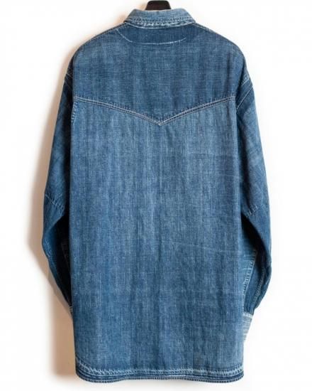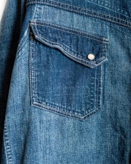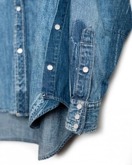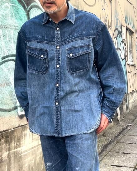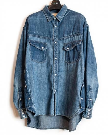 SEVESKIG セヴシグ Vintage S.Horne Denim Shirt SH-SV-NGS-10007 クラシックを壊さず、現代に着る。 本格的なウエスタンディテールを踏襲しながら、SEVESKIGの美意識でアップデートされたデニムシャツ。 左右非対称の色落ちや経年を再現したユーズド加工は、まるで何年も愛用されたかのような風合い。 胸元のフラップポケット、スナップボタン、ヨークの切り替えなど王道のディテールを備えつつ、ゆったりとしたシルエットや長めの丈感で、レイヤードにも使いやすい仕上がりに。 軽めのアウターとして羽織るもよし、インナーに差してデニムオンデニムを楽しむもよし。 “ありそうでない”、こだわりの詰まったSEVESKIG流・新解釈ウエスタンです。 〈サイズ〉 M 着丈/79cm 袖丈/56.5cm 身幅/65cm 肩幅/52.5cm L 着丈/81cm 袖丈/58.5cm 身幅/67cm 肩幅/54.5cm 原産国 Japan 素材 MAIN:COTTON