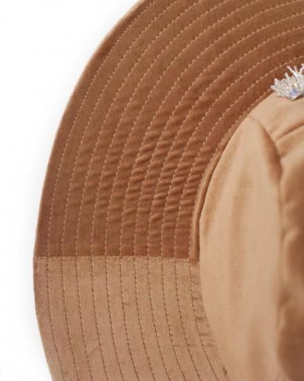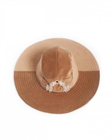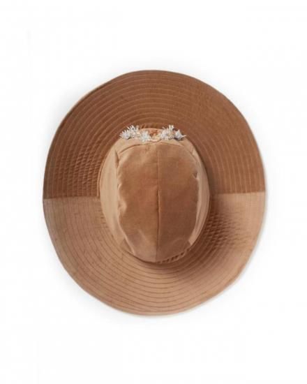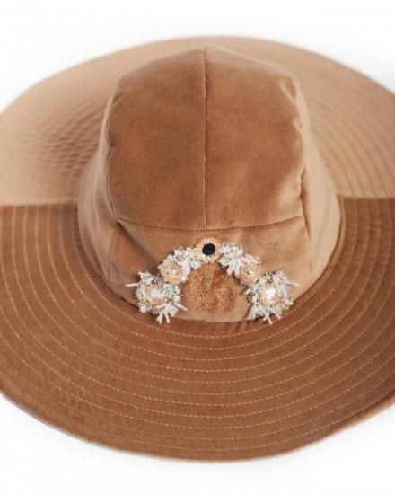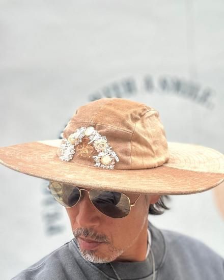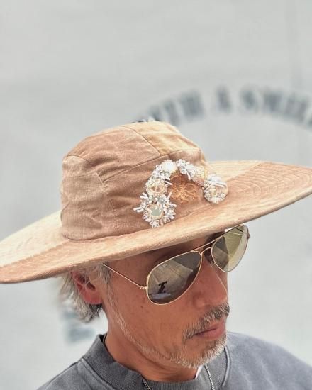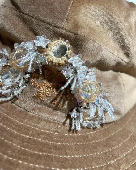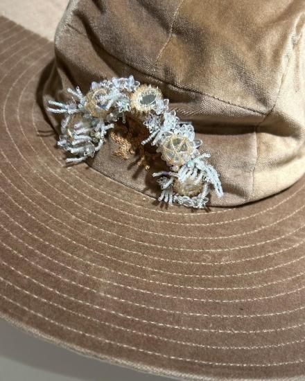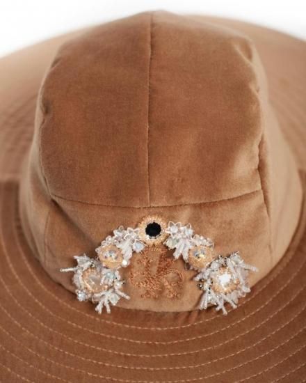 SEVESKIG セヴシグ Velvet Jet Hat ver, Hayato ベルベット ハット "上品な光沢を放つベルベット素材と、クラシックなワイドブリムのシルエットが特徴的なJet Hat。 中央にあしらわれた立体的な装飾モチーフは、ジュエリーデザイナー【Hayato】によるデザインで、ジュエリーのような存在感を演出します。 落ち着いたブラックとエレガントなベージュの2色展開。 コーディネートの主役として存在感を放ち、フォーマルからアバンギャルドまで、幅広いスタイルにマッチするアイテムです。 " COTTON 100% MADE IN JAPAN